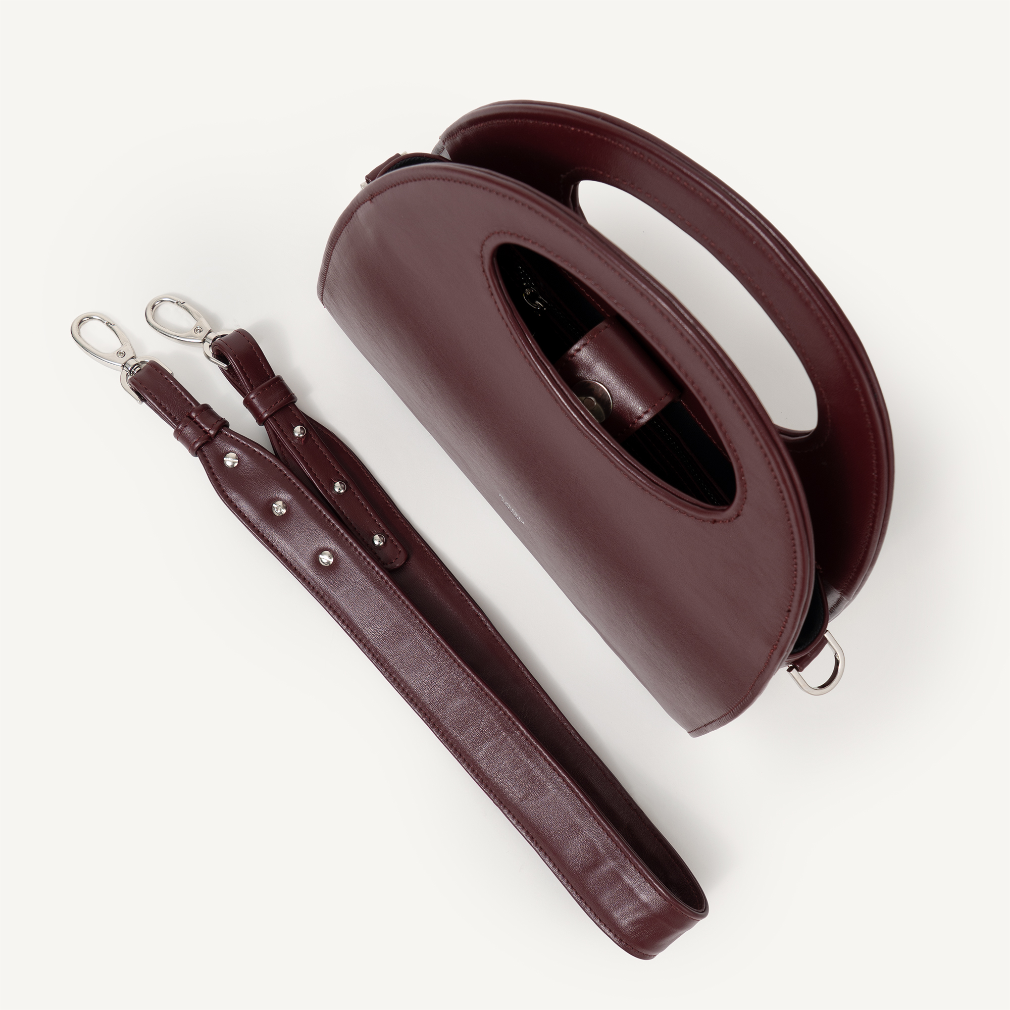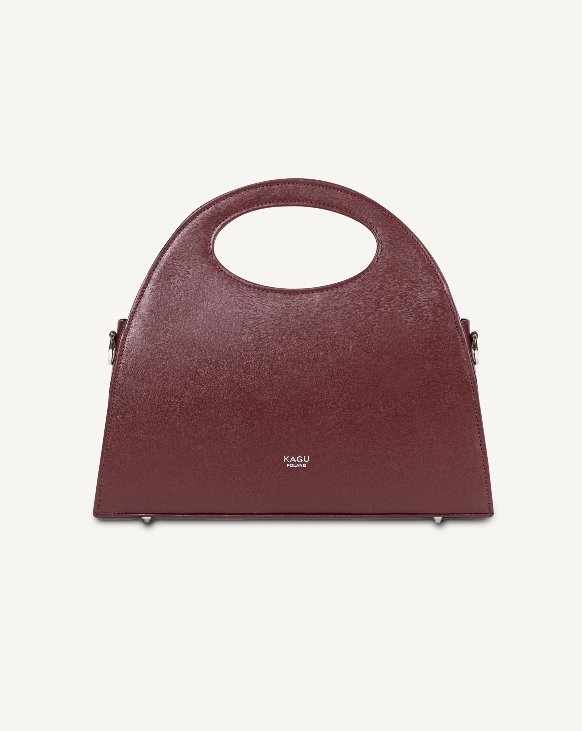 Torebka wykonana z bydlęcej skóry licowej. W zestawie z paskiem. Główna komora zamykana na zapięcie magnetyczne, wewnątrz kieszonka na suwak wpuszczona w boczną krawędź torby. Z przodu wybity srebrny stempel.